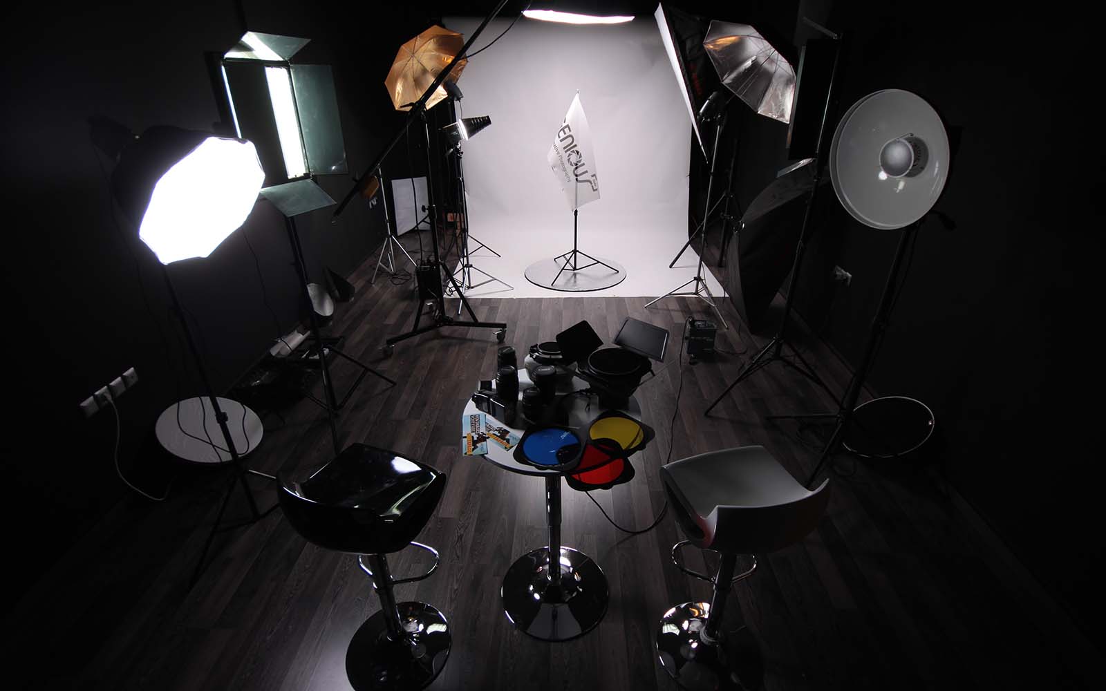 Appareil photo: Canon 5d Mark II – Canon 5d Mark III – Canon 7d, générateurs, strobes, lumières continues, bol beauté, nids d’abeilles, soft box, octobox, snoot, Background : white – green – blue – yellow, ring flash, barn door (Nid d’abeille + gelatine vert, bleu, rouge & jaune), réflecteur (white, silver & gold), backgrounds : blanc – vert – bleu – jaune – gris,